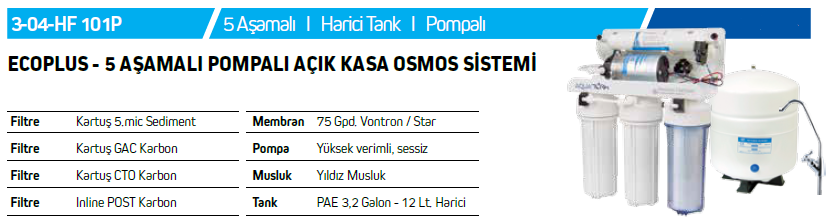AQUATÜRK ECOPLUS 3-04-HF 101P kalitenin, şıklığın ve ergonominin harmanlandığı dünya standartlarında bir su arıtma cihazıdır. Tezgah altında az yer kaplayan yapısı ve 5 aşamalı ileri filtreleme teknolojisi nedeniyle kullanıcılar tarafından sıkça tercih edilen su arıtma cihazlarındandır. Ana filtre diye bilinen membran 75 GPD değerindedir, bu da günde 250 litre suyu arıtma kapasitesi olduğunu gösterir. Bu miktardaki su ise, ev ve ofislerin günlük su ihtiyacını rahatlıkla karşılayabilir. 12 litrelik harici depolama tankı ile her zaman taze su içebilirsiniz. Dahili pompaya sahip olan bu ürün, özellikle su basıncının yetersiz olduğu yerlerde çalışmak için tasarlanmıştır. Ürünün kutusunda, lüks musluk ve gerekli tüm bağlantı ekipmanları yer almaktadır.